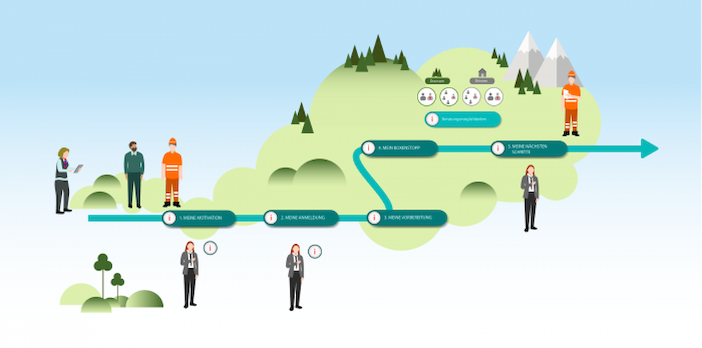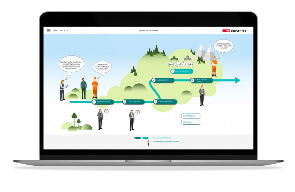 This infographic was made with the intention of accompanying the employee in his journey of work training. The learning process is framed in a landscape which makes the digital experience lighter and more enjoyable for the user.